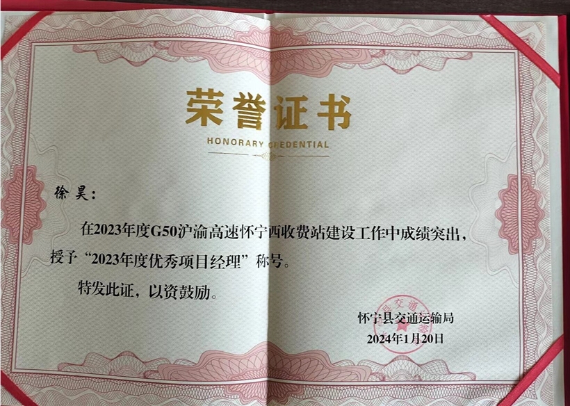 祝賀我公司懷寧西收費站項目獲得優秀項目經理榮譽