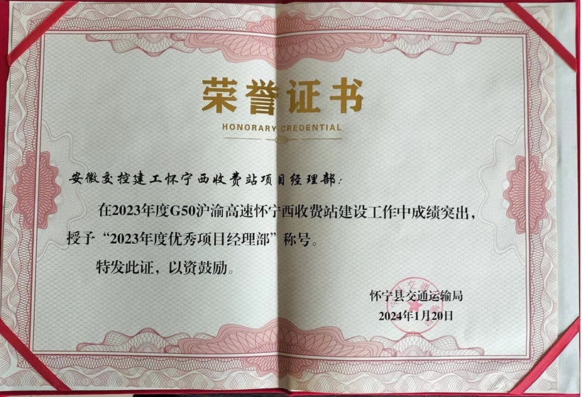 祝賀我公司懷寧西收費站項目獲得優秀項目部榮譽稱號